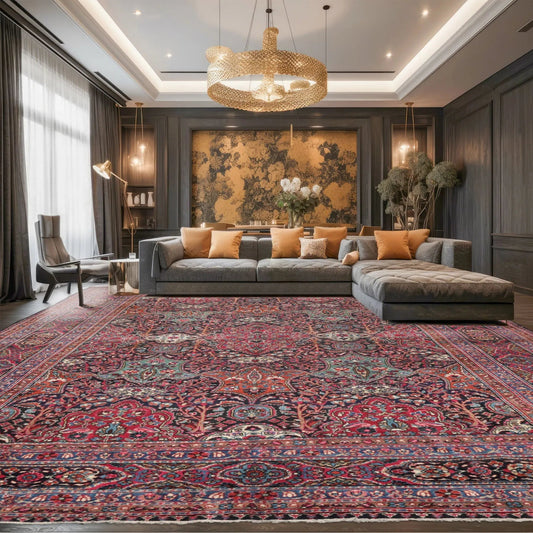 Antique 9'5'' x 13'6'' Hand Knotted 100% Wool Mashaad Traditional Area Rug Navy