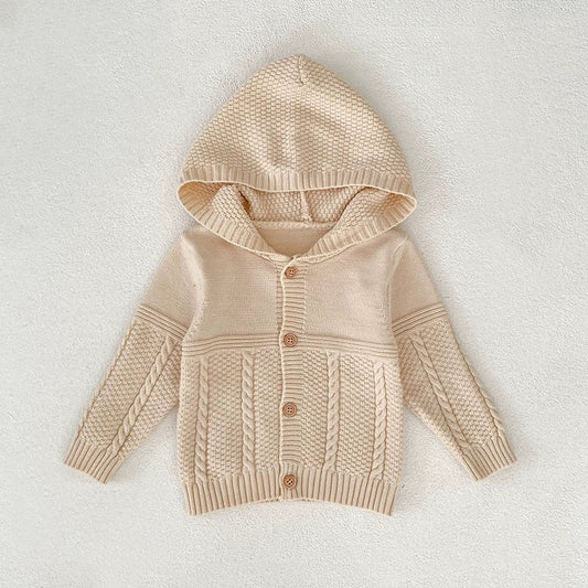 Autumn Arrival Baby Unisex Comfortable Solid Color Geometric Pattern Knitted Long Sleeves Cardigan with Hood