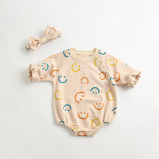Baby Girl Smiley Print Pattern Long-Sleeve Design Round Collar Onesies