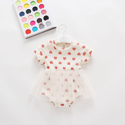 Baby Girl Mesh Patchwork Design Small Heart Print Pattern Round Neck Short-Sleeve Onesie Dress