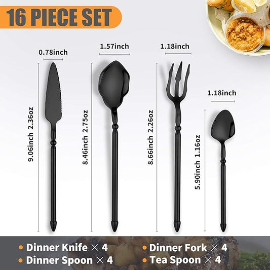 Black Unique Silverware Set,16-Piece Stainless Steel Cutlery Set for 4,Craft Flatware Set with Double-edged Knife,Mirror Polished,Dishwasher Safe