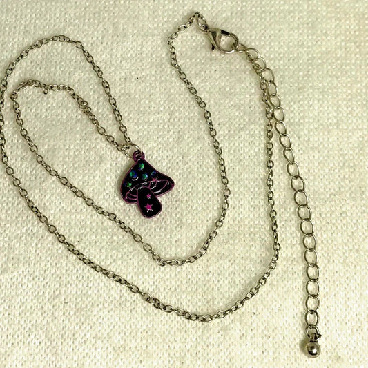 Black Toadstool on a Silver Tone Necklace w/ Rhinestones & Purple Stars - 18"