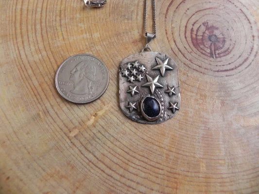 Blue Goldstone & Sterling Silver Pendant w STARS design on Silver Necklace 18.5"