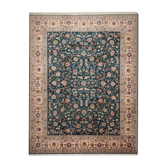 10x14 Hand Knotted Wool and Silk Traditional Tabriz 400 KPSI Oriental Area Rug Teal, Beige Color