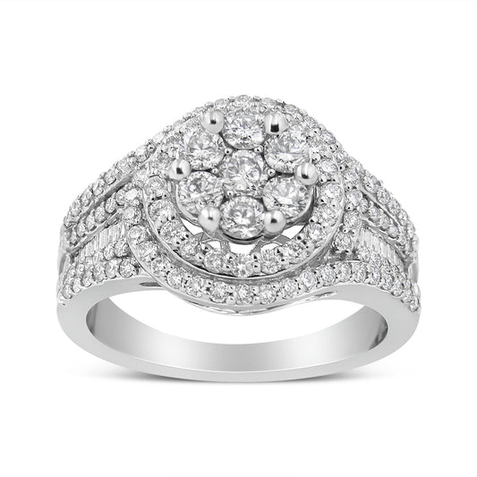 14K White Gold 1.0 Cttw Round & Baguette Cut Diamond Floral Cluster Quatrefoil Channel Set Band Cocktail Statement Ring (H-I Color, SI2-I1 Clarity)