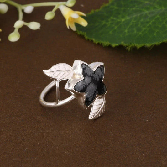 Designer Star Shape Snowflake Obsidian With Olive Leaf Silver Engagement Ring