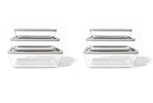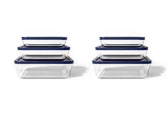 Glass Food Storage Containers - 12 Piece (6 Containers + 6 Lids) Rectangular Nesting Space-Saving Set