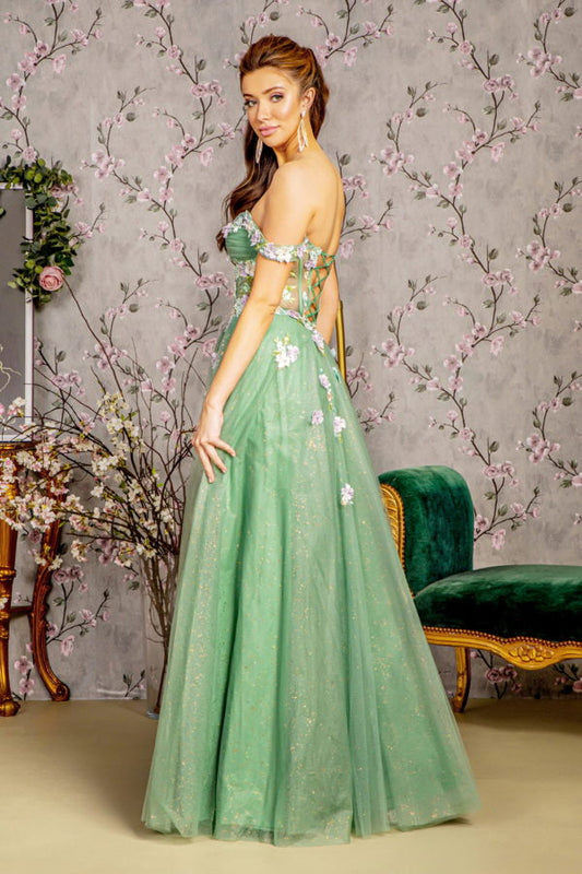 Glitter Jewel Sheer Bodice Off Shoulder Mesh A-line Long Dress