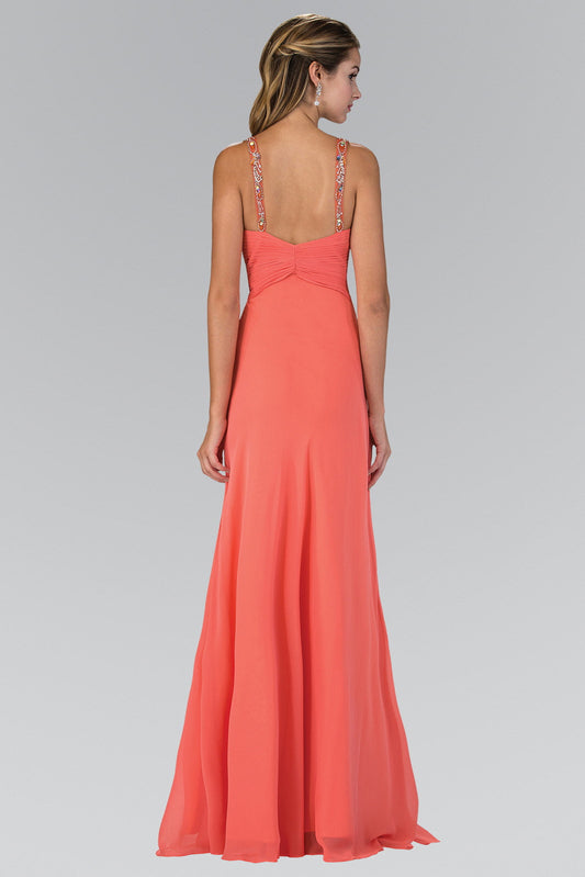 Jewel Embellished Chiffon Long Dress with Ruched Bodice