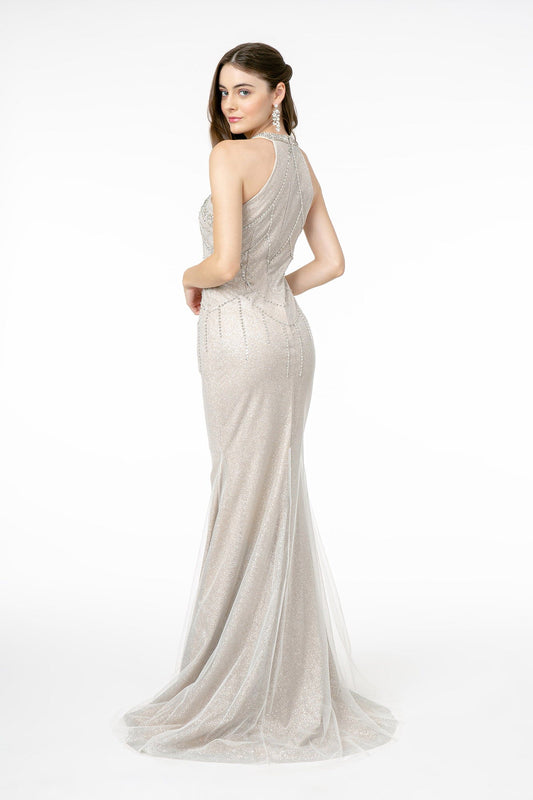 Jewel Glitter Sheer Bodice Mesh Mermaid Long Dress