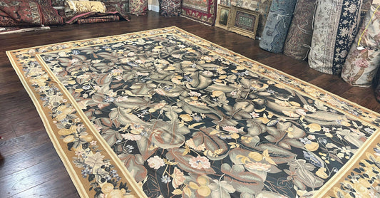 Large Needlepoint Rug 9x13, Handmade Wool Flatweave Vintage Rug, Leaves, Green