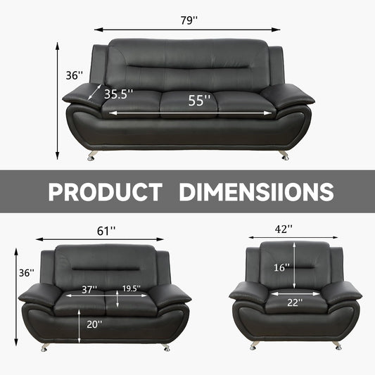 Living Room Furniture Set, Faux Leather Sofa Couch Set, 3 Pieces Modern Sofa Set for Living Room/Apartment/Office (Black)