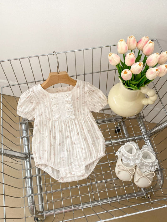New Summer Girls Floral Print Pleat Design Short Sleeves Onesies