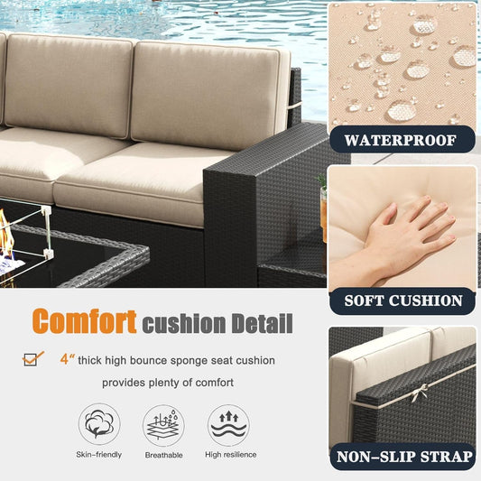 Patio Furniture Set, 5PCS Outdoor Conversation Sets Waterproof Rattan Sectional Sofa with 4” Thickened Cushion Modular Wicker Patio Furniture Set with Glass Top Table for Balcony, Backyard (Grey)