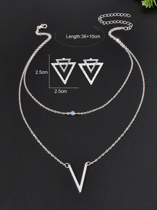 Silver V Pendant Necklace with Triangle Earrings Jewelry Set