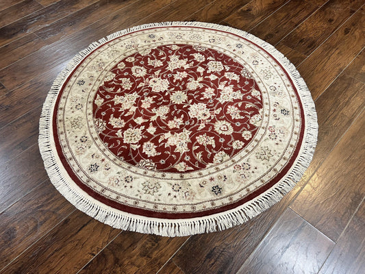 Sino Persian Round Rug 4x4, Wool Hand Knotted Oriental Carpet, Maroon & Ivory Vintage Rug, Floral Rug, Traditional Rug 4 x 4, Fine Rug