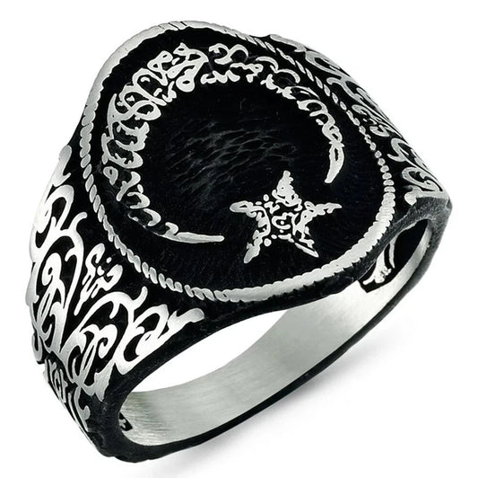 Solid 925 Sterling Silver Crescent Moon Star the Word Tawheed Islamic Men's Ring