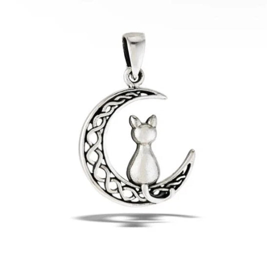 Sterling Silver Moon Cat Pendant Necklace, Cat Jewelry, Moon and Stars