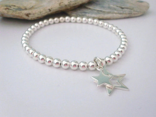Sterling Silver Stretch Bead Bracelet with Double Star Charms, Gift Boxed, Sizes