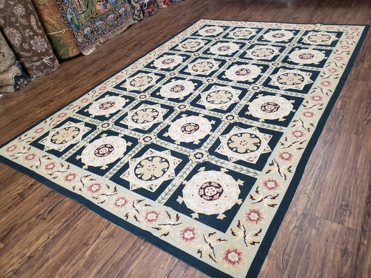 Vintage Chinese Needlepoint Rug 6x9, Panel Design Area Rug Wool Hand-Woven Black & Ivory Carpet Flat Weave Bedroom Rug 6 x 9 Living Room Rug