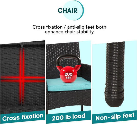 3 Piece Outdoor Furniture Set Patio Wicker Chairs Furniture Bistro Conversation Set 2 Rattan Chairs with Blue Cushions and Glass Coffee Table for Porch Lawn Garden Balcony Backyard