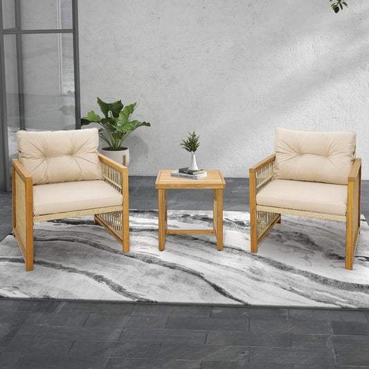 3 Pieces Acacia Wood Patio Furniture Set, PE Wicker Bistro Set with Cushioned Chairs and Coffee Table, Outdoor Conversation Set for Porch, Deck, Balcony, Backyard (Beige)