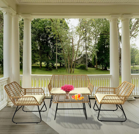 4 Pieces Outdoor Rattan Furniture Set with Glass Table