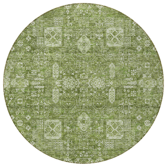8' Artichoke Green And Ivory Round Oriental Washable Indoor Outdoor Area Rug