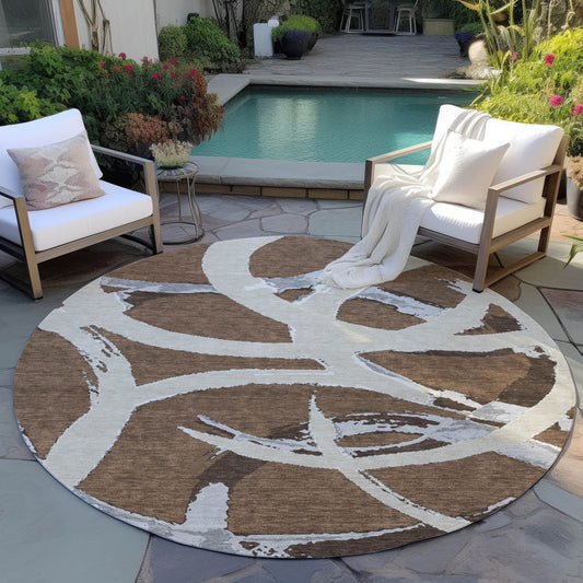 8' Brown Beige And Gray Round Abstract Washable Indoor Outdoor Area Rug