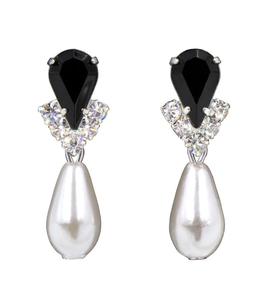 #5538JETS - Rhinestone Pear V Pearl Drop Earrings - Jet Silver Plated