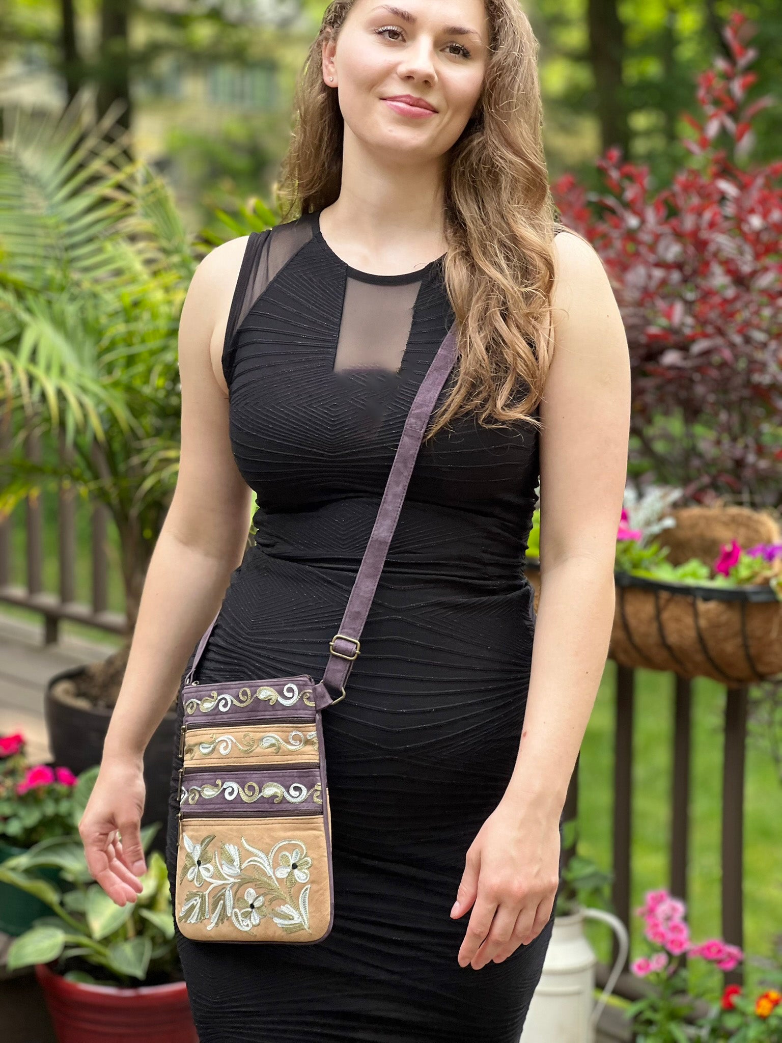 This Contemporary and functional light brown cross-body bag gives a stylish look. This embroidered floral bag has beautiful patterns, colors, and an adjustable suede strap.